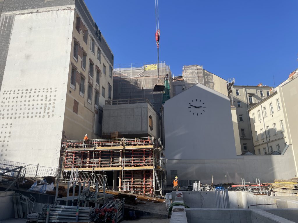 Hotová je převrtávaná pilotová stěna i přeložky vysokého a nízkého napětí. Aktuálně se pracuje na zesilování konstrukcí 1. a 3. podzemního podlaží hlavního objektu koncertního sálu. Místní zaznamenali v průběhu loňského roku i hlasité bourací práce, které připravily propojení hotových podzemních částí s těmi nově vznikajícími.